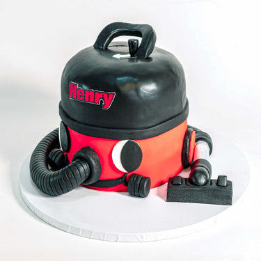 Our Henry Hoover Cake - The iconic vacuum recreated in cake! Covered with fondant and to look just like the real thing, complete with hose, wheels and its cheeky little face. Made with alternating layers of light fluffy sponge and silky buttercream, lots of flavours to choose from, the cake will look the same no matter which one you go for.