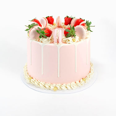 A glamorous version of our classic Vanilla cake, made with alternating layers of light, fluffy vanilla sponge, silky vanilla buttercream and fresh strawberries. Topped off with a white chocolate drip, handmade macarons and fresh strawberries. Made with free range organic eggs and belgian chocolate.