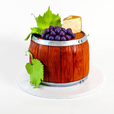 Our Wine Barrel Cake is the perfect treat for wine lovers! Designed to resemble a rustic wine barrel, this cake is covered in smooth fondant and decorated with handcrafted fondant grapes, vine leaves, and even a little block of cheese for a playful touch. Inside, you’ll find alternating layers of light, fluffy sponge and silky buttercream, with a variety of delicious flavours to choose from. No matter which flavour you pick, the cake will maintain its stunning wine-themed design, making it an impressive centrepiece for any celebration.