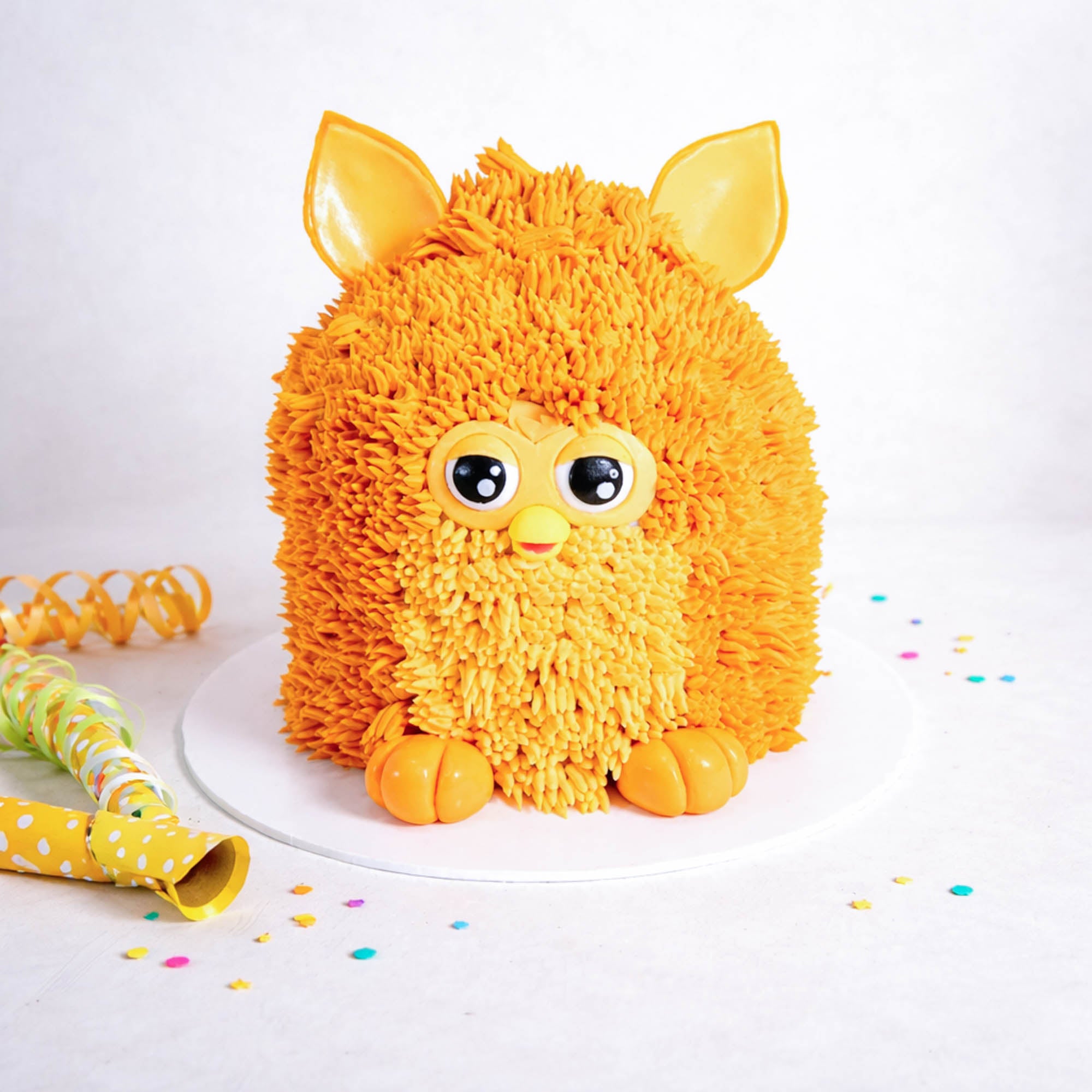 Our retro Furby Cake with buttercream 'fluff' and fondant face, feet and ears. With alternating layers of light fluffy sponge and silky buttercream, lots of flavours to choose from, the cake will look the same no matter which one you go for.