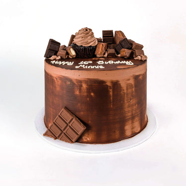 Our Chocolate Overload Cake, made with alternating layers of rich, moist chocolate sponge, and silky chocolate buttercream. Topped off with a mixture of chocolate bars, biscuits, cupcakes and more chocolate! Made with free range organic eggs and belgian chocolate.
