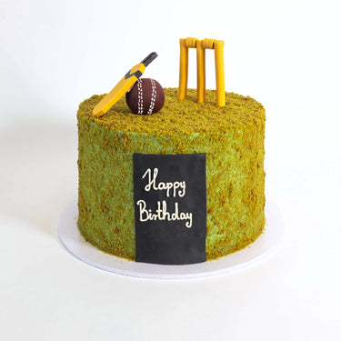 Our bat and ball themed Cricket Cake, covered with a soft green crumb to look like grass and decorated with a sugar paste bat, ball and wicket. We’ve added an edible ‘chalk board’ to the front which we can personalise with any message up to 30 characters. With alternating layers of light fluffy sponge and silky buttercream, lots of flavours to choose from, the cake will look the same no matter which one you go for.