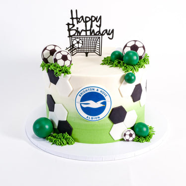 Our Football Cake, perfect for sports fans! Made with alternating layers of soft, fluffy sponge and silky buttercream, it’s as delicious as it is fun. The cake is fully covered in buttercream and decorated with fondant football-themed details, including a badge representing the club of your choice. Simply type the name of the club in the box, and we’ll personalise the cake to match. If you’d prefer no badge, just leave the box blank!