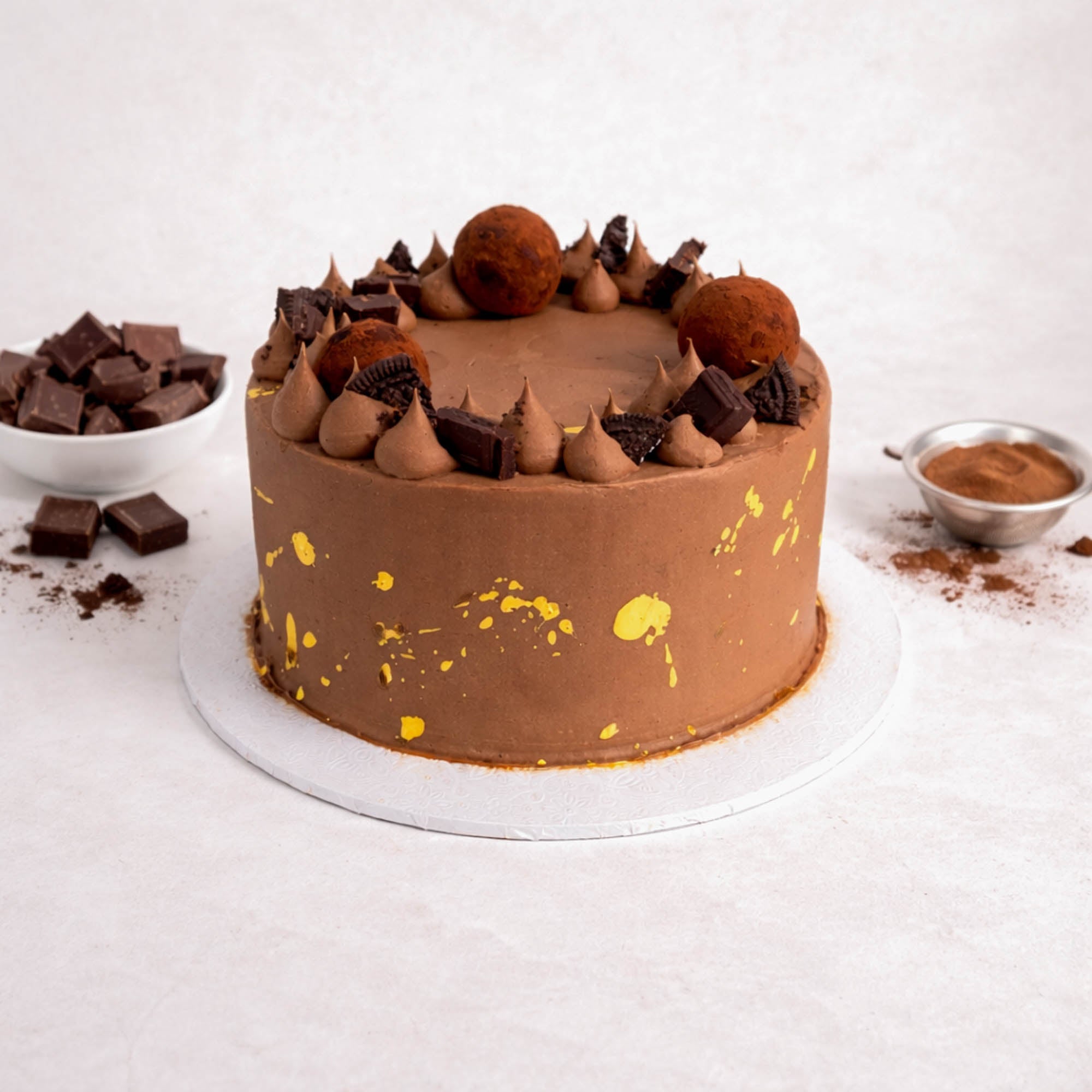A mini version of our signature Triple Chocolate Cake, made with alternating layers of rich, moist chocolate sponge, and silky chocolate buttercream. Topped off handmade chocolates, gold splatter, and piped chocolate details. Made with free range organic eggs and belgian chocolate.