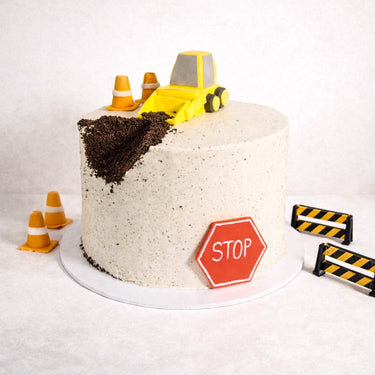 Our hard at work Digger Cake covered with buttercream 'concrete' and a handmade fondant digger. With alternating layers of light fluffy sponge and silky buttercream, lots of flavours to choose from, the cake will look the same no matter which one you go for.