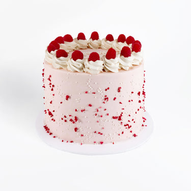 Our decadent Raspberry White Chocolate Cake, made with alternating layers of rich, moist vanilla sponge, fresh raspberries, raspberry preserve and silky white chocolate buttercream. covered with sprinkles and topped off with buttercream swirls and fresh raspberries. Made with free range organic eggs and belgian chocolate.