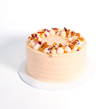 A mini version of our Classic Carrot Cake, made with alternating layers of light, fluffy carrot based sponge, with mascarpone buttercream. Topped off with piped buttercream details, crushed biscuits, orange pieces and edible petals. Made with free range organic eggs.
