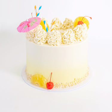 Our Cocktail Cake, made with alternating layers of light fluffy sponge and silky buttercream, lots of flavours to choose from, the cake will look the same no matter which one you go for. Topped off with crystallised pineapple, coconut shavings, buttercream swirls and a mini parasol. Made with free range organic eggs.