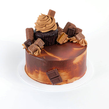 Our Chocolate Overload Cake, made with alternating layers of rich, moist chocolate sponge, and silky chocolate buttercream. Topped off with a mixture of chocolate bars, biscuits, cupcakes and more chocolate! Made with free range organic eggs and belgian chocolate.