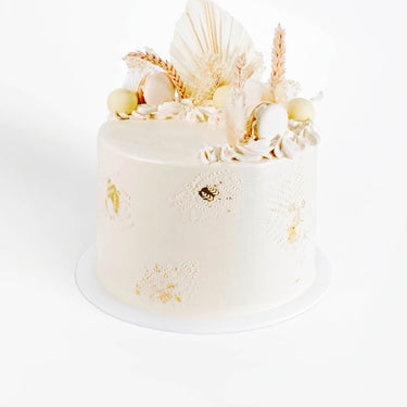 Our chic Dried Grasses Cake, made with alternating layers of moist, fluffy sponge and silky buttercream. Covered with buttercream and decorated with a buttercream stencil, gold leaf and dried grasses. Topped off with macaroons and truffles. With lots of flavours to chooses from the cake will look the same regardless of the flavour inside.