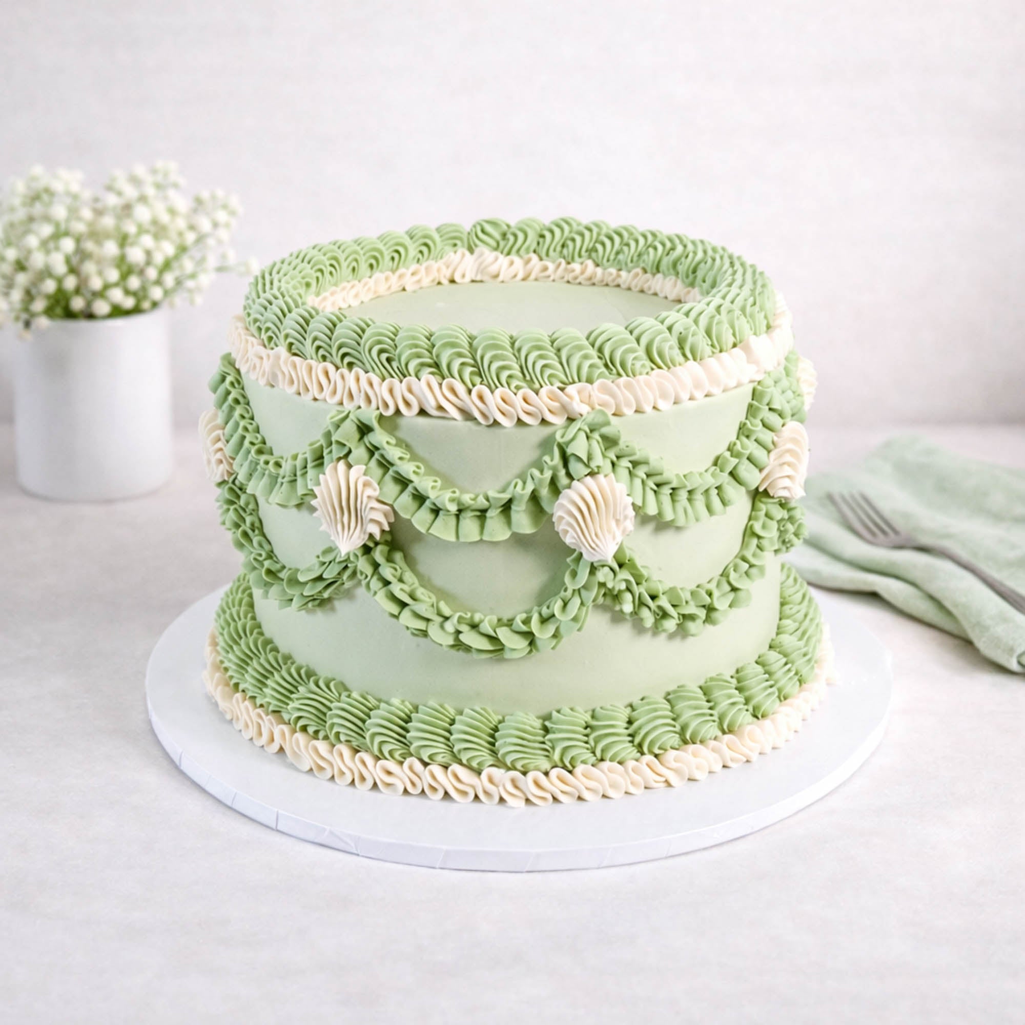 Our extravagant vintage Frilly Cake, made with alternating layers of light, fluffy sponge and silky buttercream. We pipe multiple layers of buttercream using different piping nozzles to create this classic retro look. The cake will look the same no matter which flavour you go for.