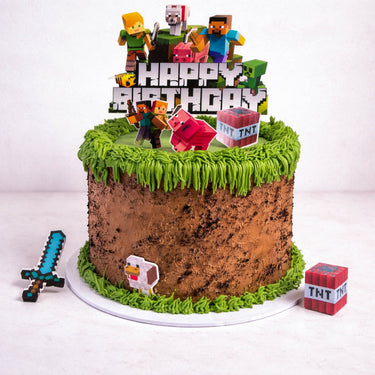 Our Minecraft Cake. Covered with chocolate buttercream to look like dirt and piped green buttercream to look like grass, decoated with non edible minecraft figures and a 'Happy Birthday' topper. Made with alternating layers of light fluffy sponge and silky buttercream, lots of flavours to choose from, the cake will look the same no matter which one you go for.
