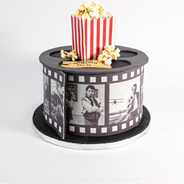 Our Movie Cake perfect for any film buff. Covered with fondant and decorated with movie stills to look like a roll of film, with a ‘box’ of popcorn on top and real popcorn overflowing. Made with alternating layers of light fluffy sponge and silky buttercream, lots of flavours to choose from, the cake will look the same no matter which one you go for.