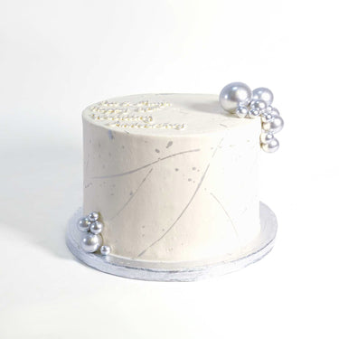 Our glamorous Silver Cake is a stunning creation, perfect for adding a touch of elegance to any occasion. Covered in smooth buttercream and adorned with artistic splatters of edible silver icing, the cake is further enhanced by non-edible silver balls for a sophisticated, eye-catching finish.