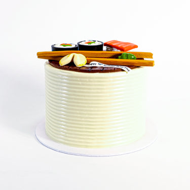 Our Sushi Cake is a fun and creative twist on a traditional cake, perfect for sushi lovers! Covered in smooth buttercream, this unique cake is adorned with intricate decorations, including chopsticks, a fortune cookie, and various sushi pieces, all handcrafted from sugarpaste to look amazingly realistic.