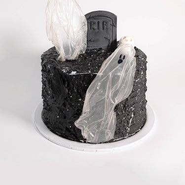 Our terrifying tombstone cake, covered with rustic black buttercream and a silver splatter. Complete with scary ghosts and a fondant tombstone and scull. With alternating layers of light fluffy sponge and silky buttercream, lots of flavours to choose from, the cake will look the same no matter which one you go for.