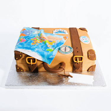 Our travellers Suitcase Cake, made with alternating layers of light, fluffy sponge, and silky buttercream. Decorated with fondant to look just like a leather suitcase, complete with gold buckles, a map and travel stickers.