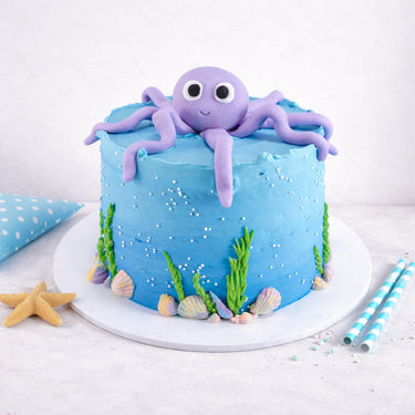 Our ocean themed Under The Sea Cake, covered with wavy blue OmbrŽ buttercream and decorated with shells, seaweed and a giant friendly octopus. With alternating layers of light fluffy sponge and silky buttercream, lots of flavours to choose from, the cake will look the same no matter which one you go for.