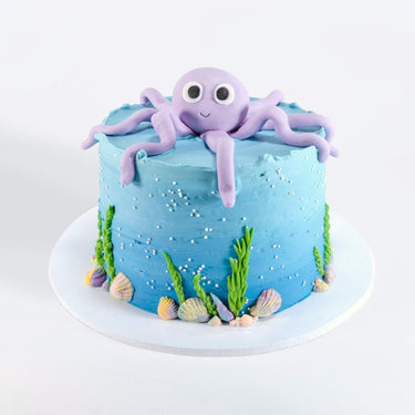 Our ocean themed Under The Sea Cake, covered with wavy blue ombré buttercream and decorated with shells, seaweed and a giant friendly octopus. With alternating layers of light fluffy sponge and silky buttercream, lots of flavours to choose from, the cake will look the same no matter which one you go for.
