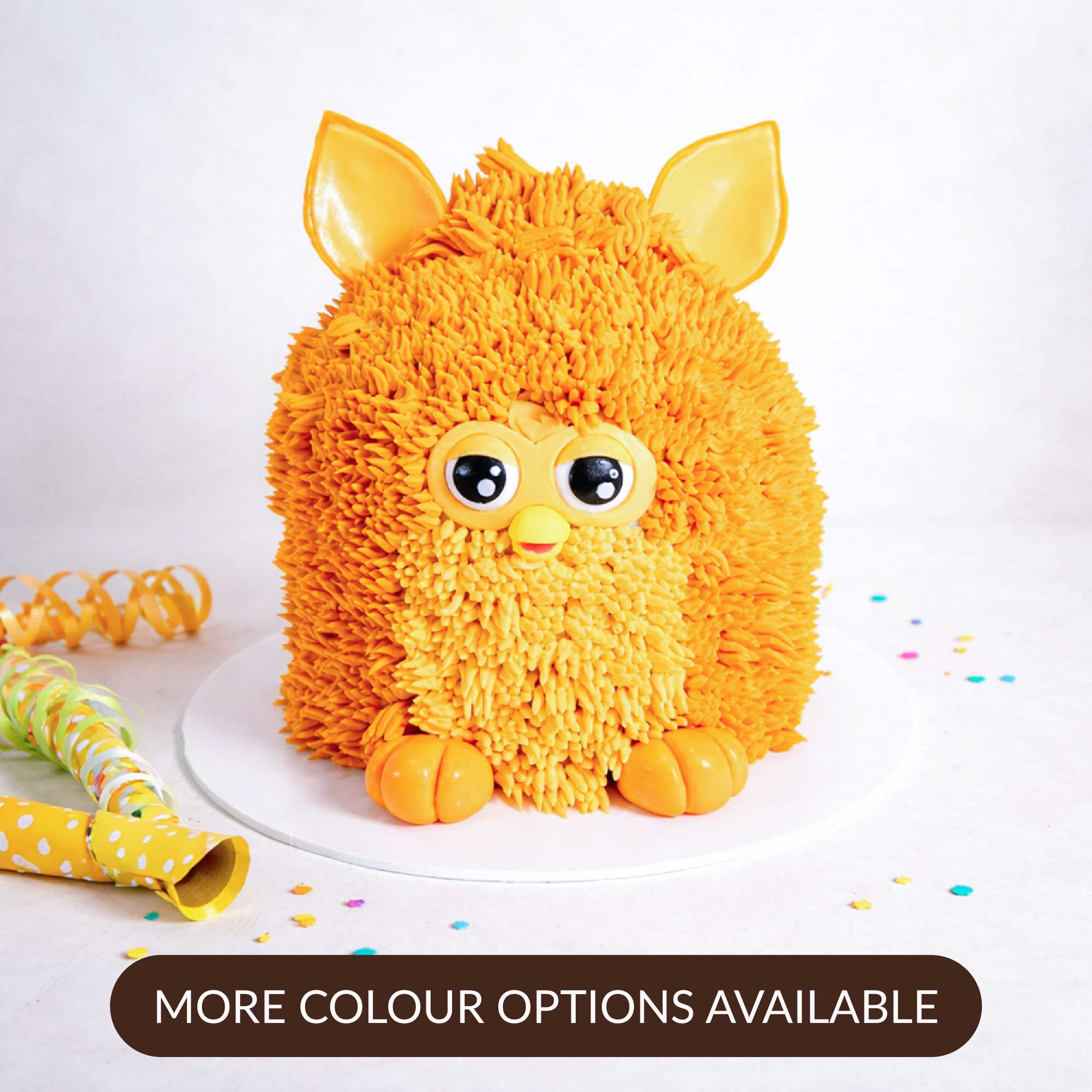 Personalise your Furby Cake by selecting up to two colours—simply enter your choices in the box above. Leaving this blank will result in the classic design pictured. Kindly be aware that some fondant elements may include wire supports and are not edible.