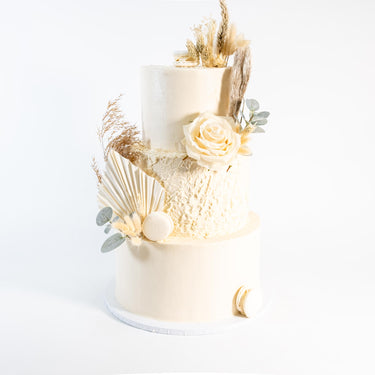 This boho-style wedding cake is finished with a combination of smooth and textured buttercream. It’s perfect for those opting for a more laid-back style wedding in a barn or marquee, yet it still blends in seemlessly in more formal surroundings. It is decorated with a combination of dried grasses, palm leaves, and a couple of our beautiful silk flowers. We hand-make all our wedding cakes to order in our Sussex bakery, with a wide range of flavours and fillings available.