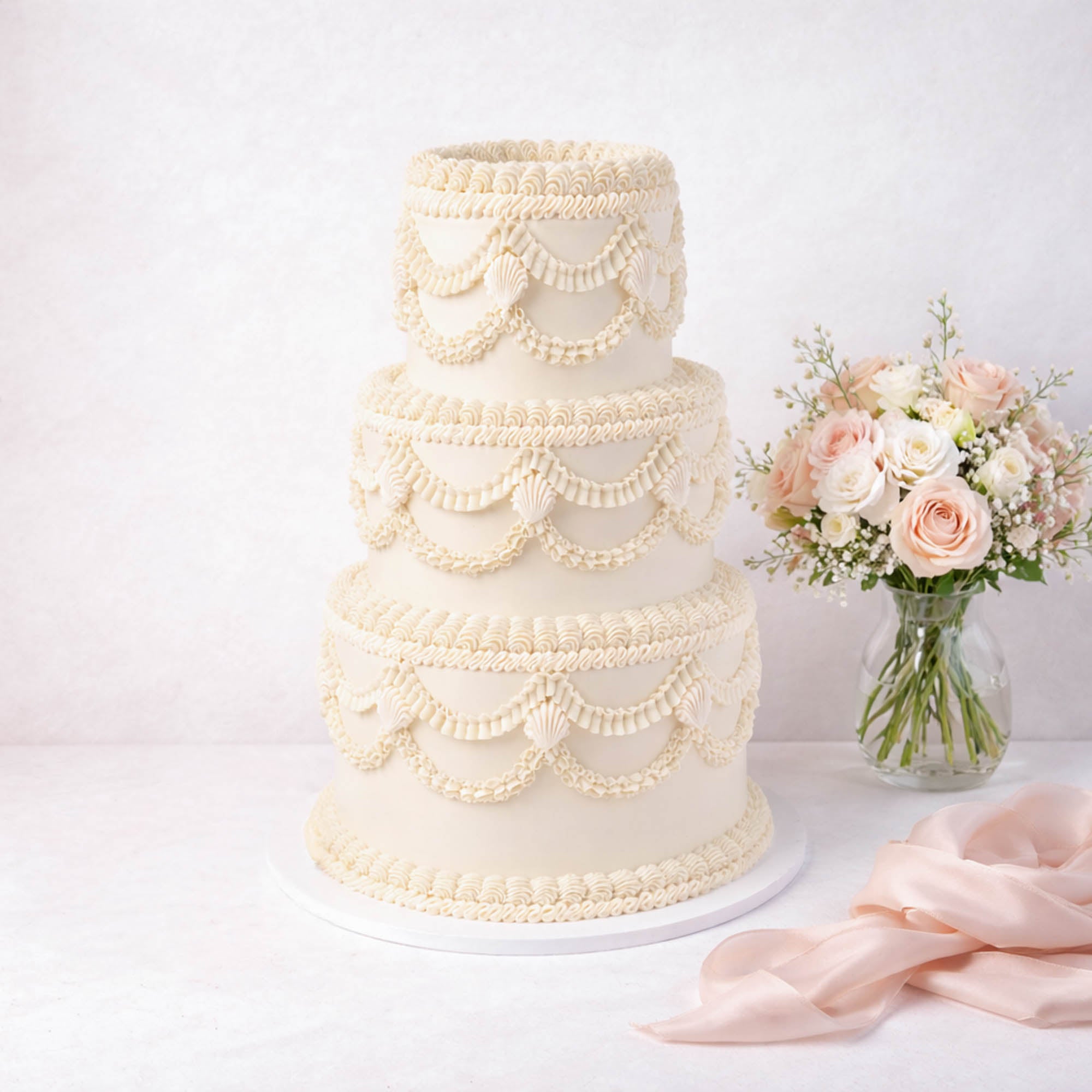 Our vintage Frilly Wedding Cake - Free Delivery, made with alternating layers of light, fluffy sponge and silky buttercream. We pipe multiple layers of buttercream using different piping nozzles to create this classic retro look. The cake will look the same no matter which flavour you go for. We hand-make all our Wedding Cake - Free Deliverys to order in our Sussex bakery, with a wide range of flavours and fillings available. For this cake, you can choose the colours of the buttercream (up to 3 colours) and if you'd like cherries added for decoration.