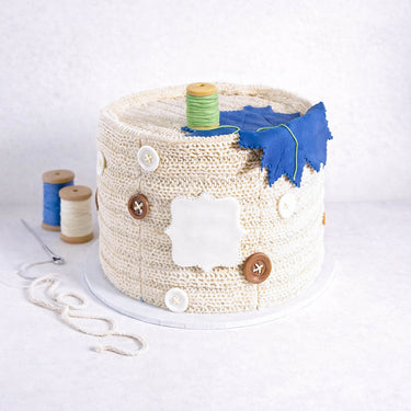 Celebrate your love for sewing, knitting, or crocheting with the Harry Batten 'Free From' Needlecraft Cake. This bespoke creation showcases edible fondant designed to resemble knitted fabric, complete with delicate sugar buttons, thread, and a sugar paste fabric swatch for an authentic handcrafted appearance. Inside, alternating layers of light sponge and smooth buttercream provide a refined flavour experience. Delivered across London, Sussex, and Surrey, it’s an ideal centerpiece for any craft enthusiast’s occasion.