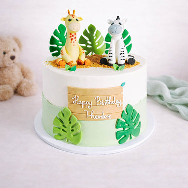Discover the ‘Free From’ Safari Cake by Harry Batten, crafted with layers of light, airy sponge and velvety buttercream. This expertly decorated cake features fondant leaves, delightful animal figures, and edible ‘sand’ to create a captivating safari theme. Personalise with a custom message or appreciate its refined design. Please note, fondant decorations may include wire supports and are not edible. Available for delivery in London, Sussex, and Surrey.