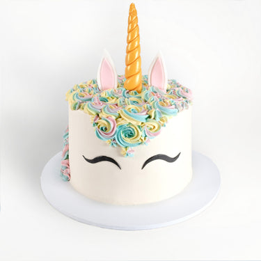 Our magical unicorn cake, covered in white buttercream with a hand piped rainbow buttercream mane, complete with fondant unicorn ears and a gold unicorn horn. With alternating layers of light fluffy sponge and silky buttercream, lots of flavours to choose from, the cake will look the same no matter which one you go for.