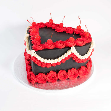 A spooky version Frilly Heart Cake, made with alternating layers of light, fluffy sponge and silky buttercream. Cut in the shape of a love heart, we pipe multiple layers of buttercream using different piping nozzles to create this classic retro look. The cake will look the same no matter which flavour you go for.