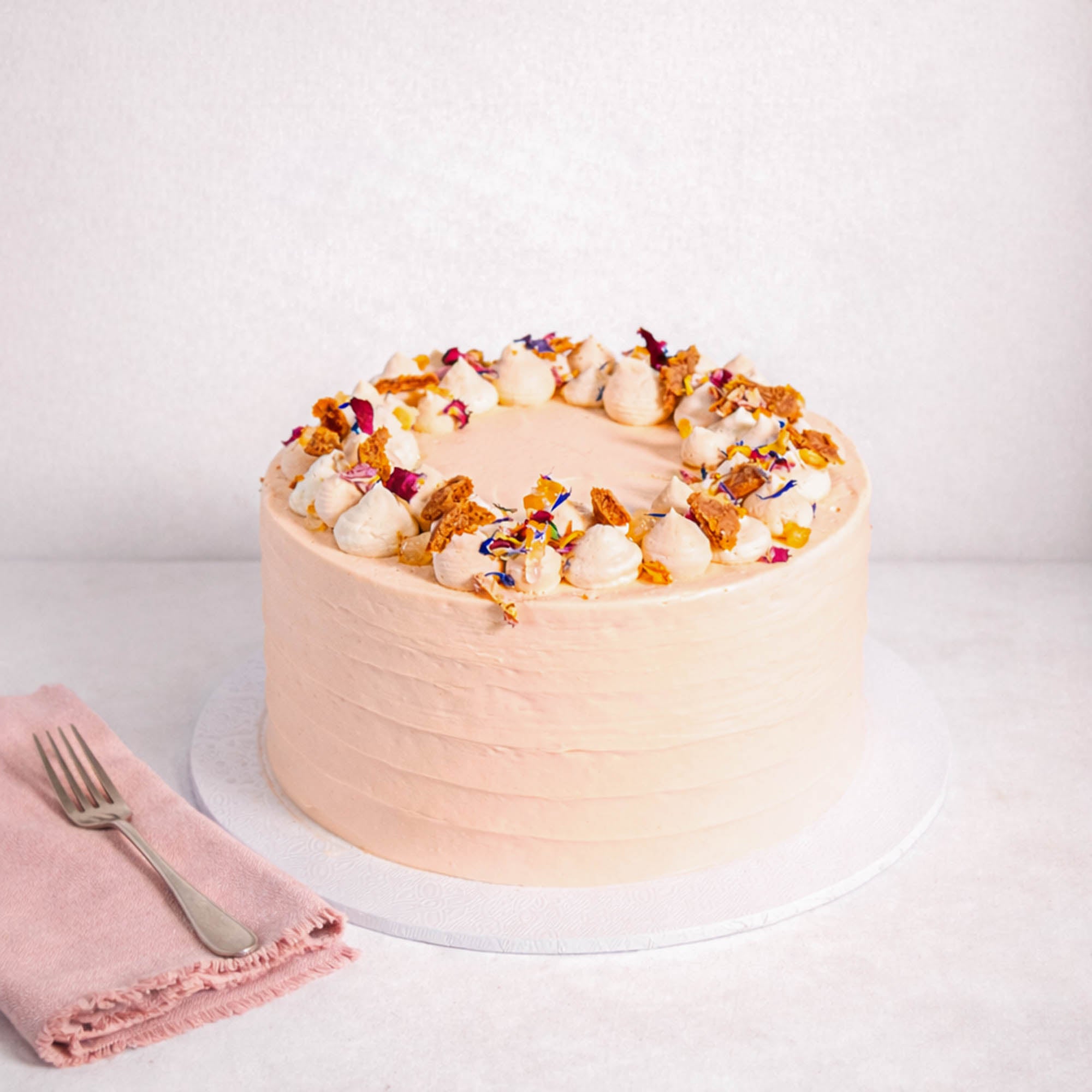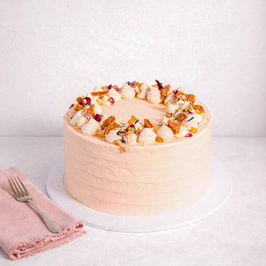 A mini version of our Classic Carrot Cake, made with alternating layers of light, fluffy carrot based sponge, with mascarpone buttercream. Topped off with piped buttercream details, crushed biscuits, orange pieces and edible petals. Made with free range organic eggs.