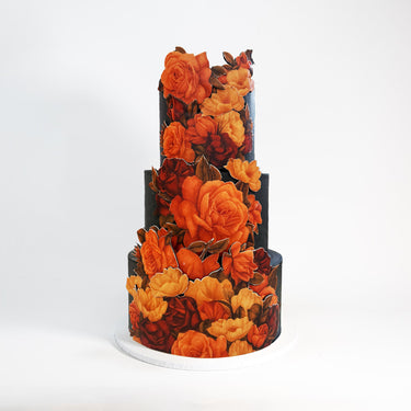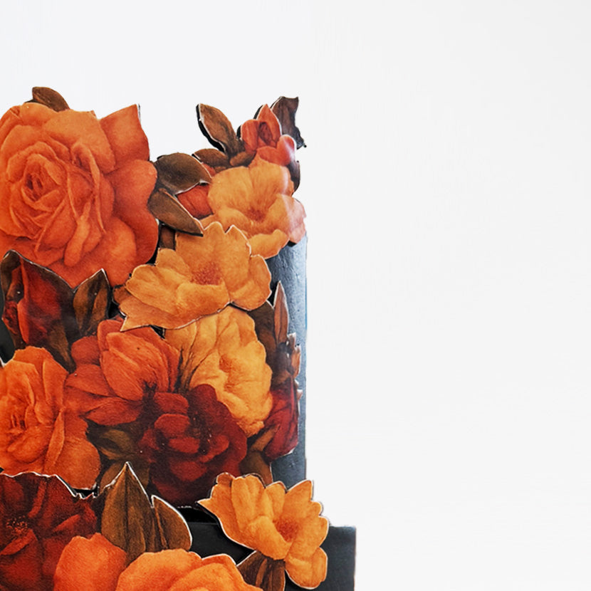 You can specify your colour scheme in the personalisation box above, please note, if you do not specify a colour scheme, we will create the cake as per the image above. For this cake you can specify the base colour (in the photo it is black) and the colour of the florals (unfortunately you can not choose the type of florals on this cake)