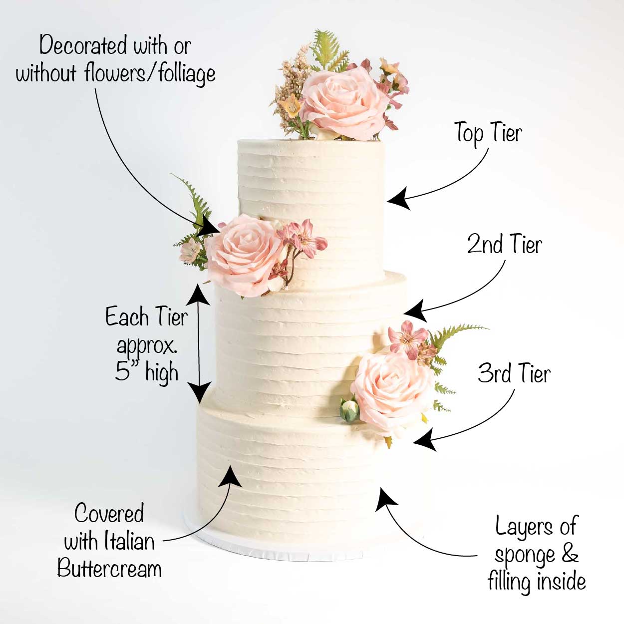 3 tier + undecorated cutting cake - This option is the same as our three-tier cake with the addition of a 12" undecorated cake. It provides approximately 150-200 portions in total. The wedding cake itself consists of a 10" diameter cake on the bottom, an 8" diameter cake in the middle, and a 6" diameter cake on top.