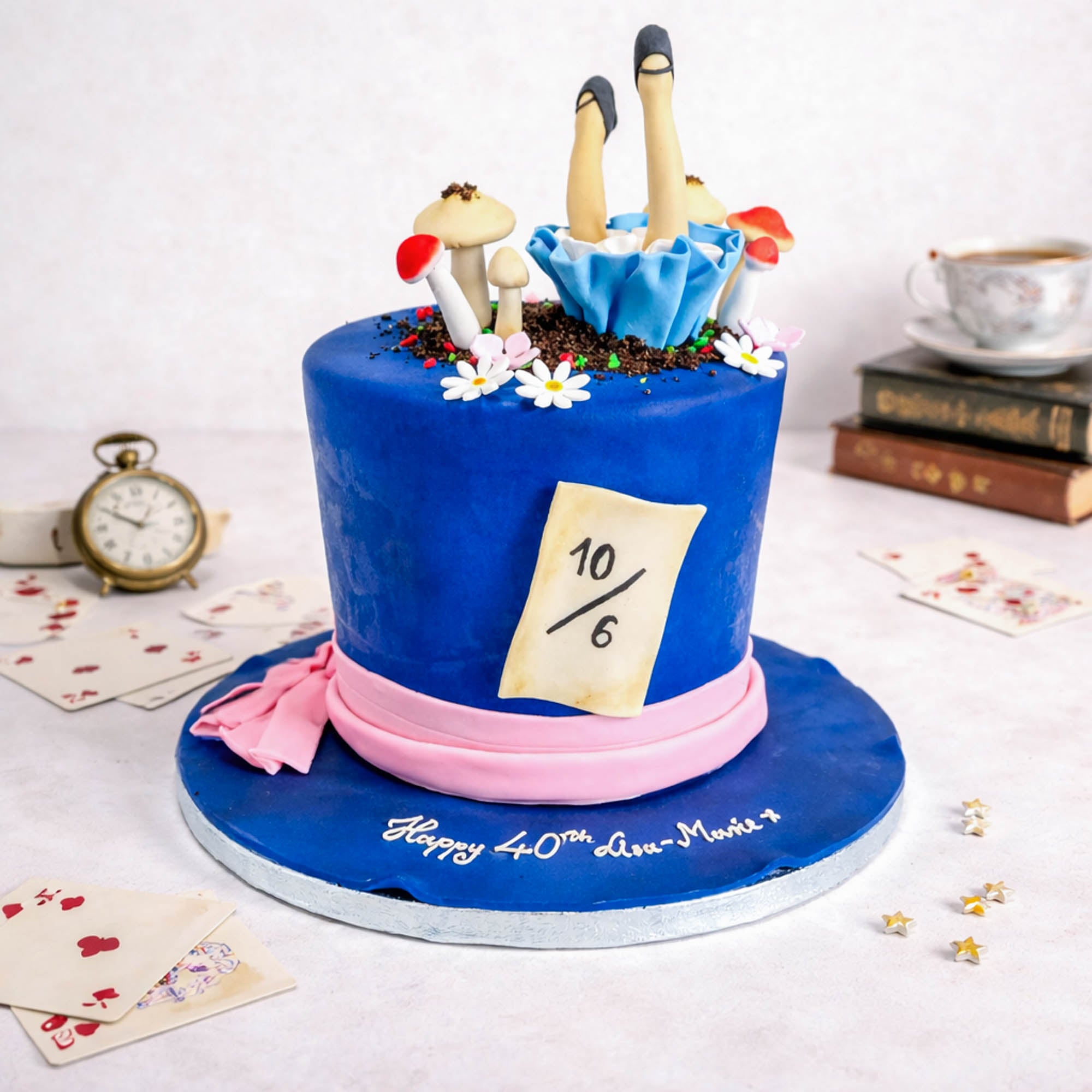 A 'Free From' version of our Alice in Wonderland Cake - a whimsical masterpiece, designed to transport you straight into the heart of Wonderland. The cake is artfully covered in fondant, crafted to resemble the iconic Mad Hatter's hat, complete with playful, vibrant colours. On top, you'll find Alice herself, tumbling down the rabbit hole, surrounded by intricate details like sugar paste mushrooms, delicate flowers, and other enchanting elements that bring the story to life.