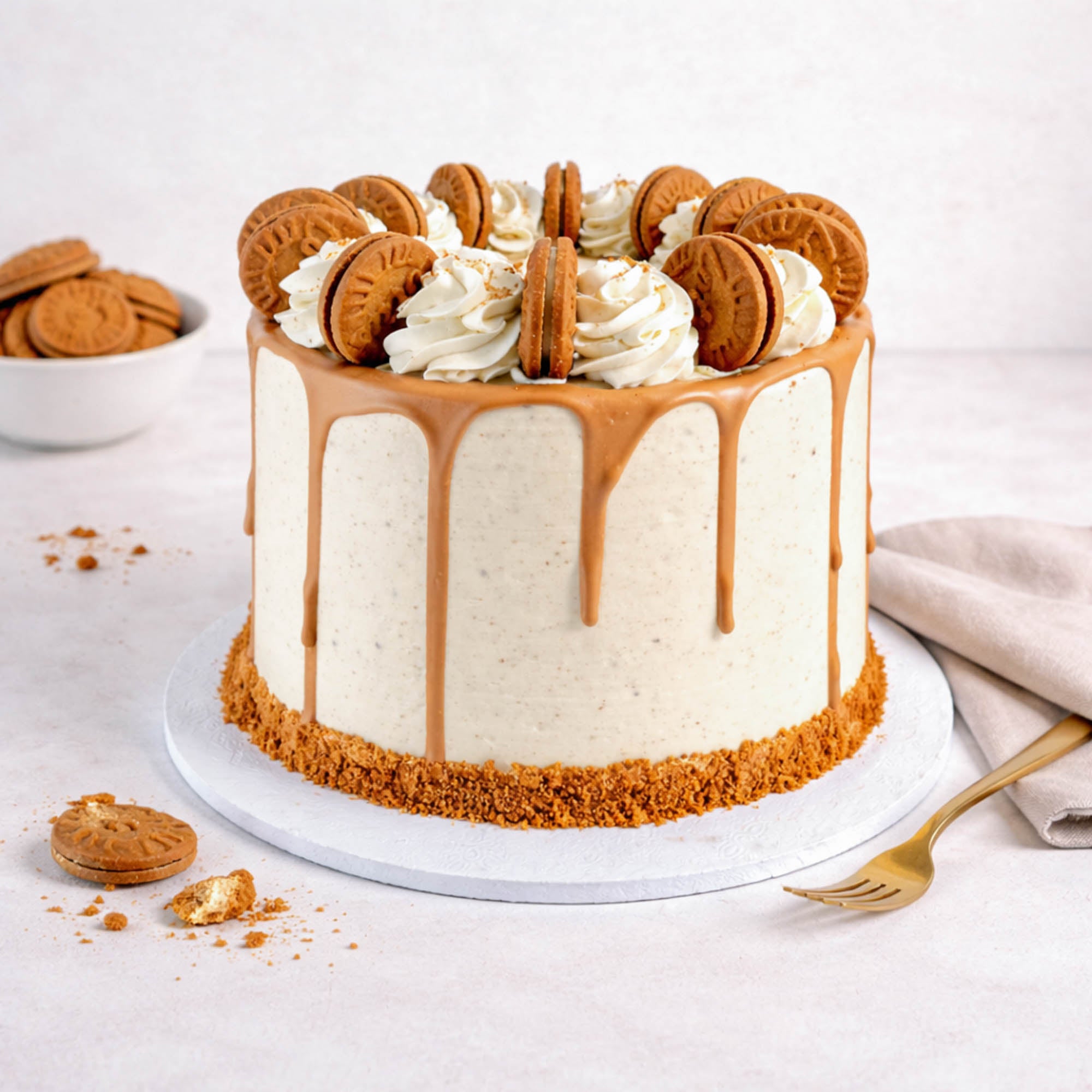 Our VEGAN Lotus based Biscoff Cake, made with alternating layers of light, fluffy sponge, crushed Lotus biscuits and silky Biscoff buttercream. Topped off piped vanilla buttercream and even more lotus biscuits.