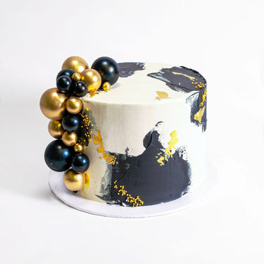 A 'free from' versions of our Black and Gold Cake - a stunning combination of moist, fluffy sponge layers and rich, silky buttercream. Decorated with elegant patches of black and white buttercream, it's accented with luxurious edible gold leaf and non-edible black and metallic gold balls for a striking visual effect. Crafted using free-range, organic eggs, this cake not only looks exquisite but also offers a delicious, high-quality treat perfect for any special occasion.