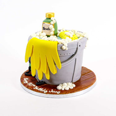 A 'Free From' of our Cleaning Bucket Cake - a quirky, fun creation designed to look just like a cleaning bucket, complete with a pair of rubber gloves, a sponge, and a little bottle of bleach—each element handcrafted with sugar paste for an authentic touch.