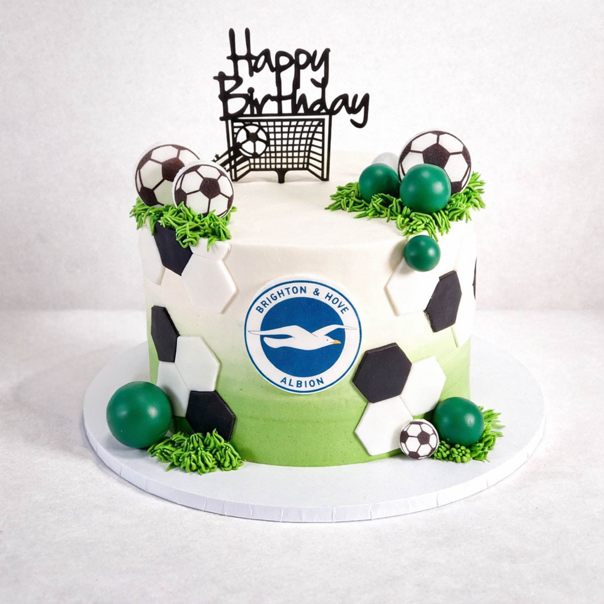 A 'Free From' verison of our Football Cake - perfect for sports fans! Made with alternating layers of soft, fluffy sponge and silky buttercream, it’s as delicious as it is fun. The cake is fully covered in buttercream and decorated with fondant football-themed details, including a badge representing the club of your choice. Simply type the name of the club in the box, and we’ll personalise the cake to match. If you’d prefer no badge, just leave the box blank!