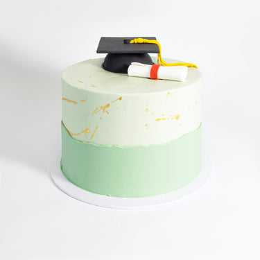 Our Graduation Cake, with 2 tone green buttercream, gold splatters and a fondant mortarboard and diploma. With alternating layers of light fluffy sponge and silky buttercream, lots of flavours to choose from, the cake will look the same no matter which one you go for.