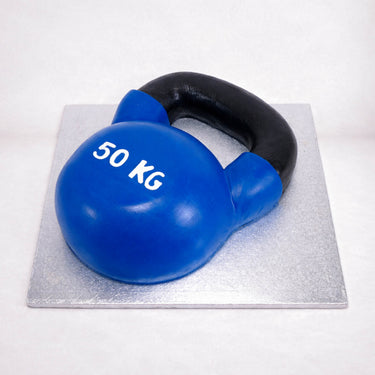 A 'Free From' version of our fitness fanatics Gym Cake, made with alternating layers of light, fluffy sponge, and silky buttercream. Covered with blue fondant and decorated to look like a kettlebell.