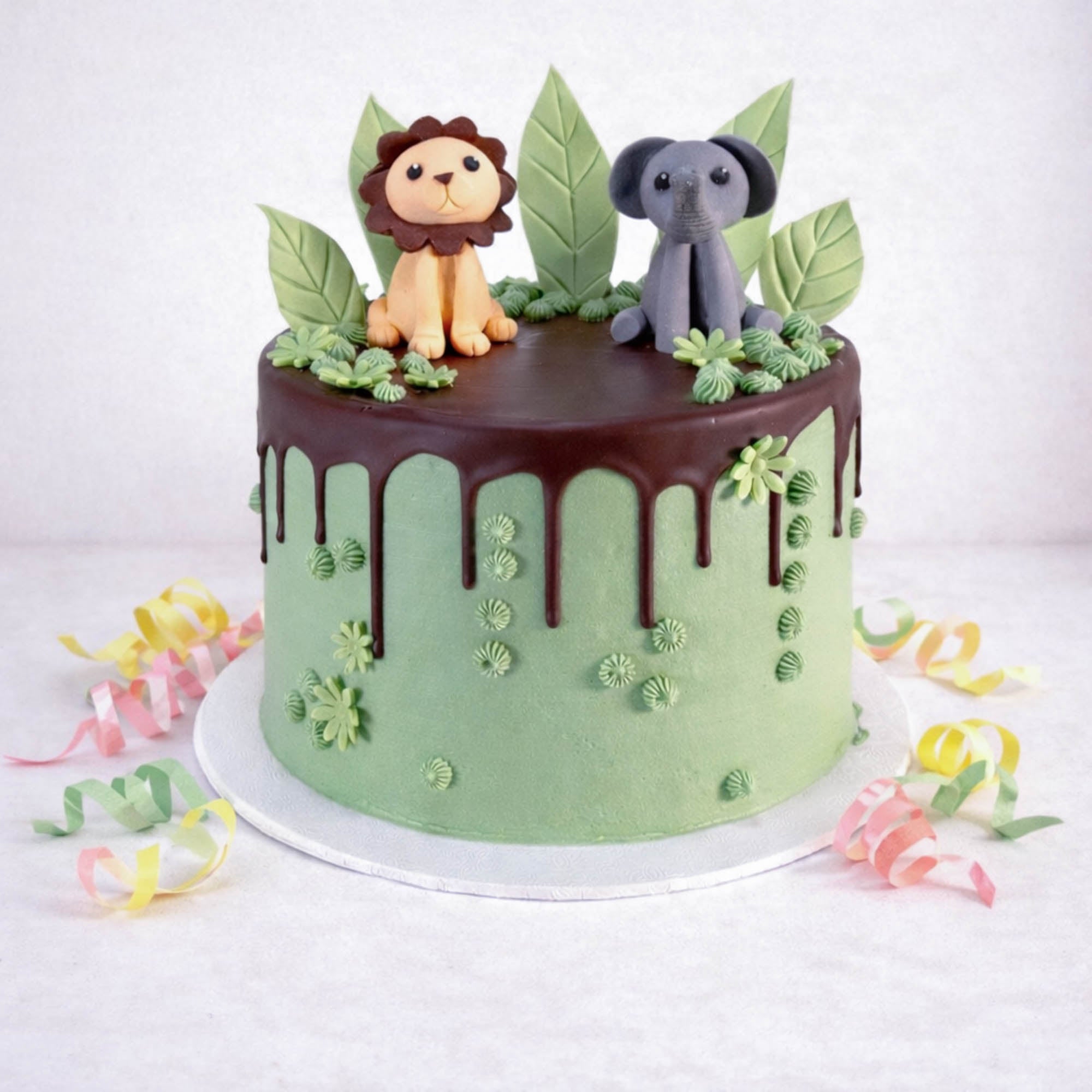 Experience the 'Free From' Jungle Cake by Harry Batten, crafted with alternating layers of airy sponge and velvety buttercream. This charming animal-themed cake is finished with a luxurious chocolate drip and meticulously handmade fondant animals, ideal for special occasions. Please be aware, fondant decorations may include wire supports and are not edible. Available for delivery in London, Sussex, and Surrey.
