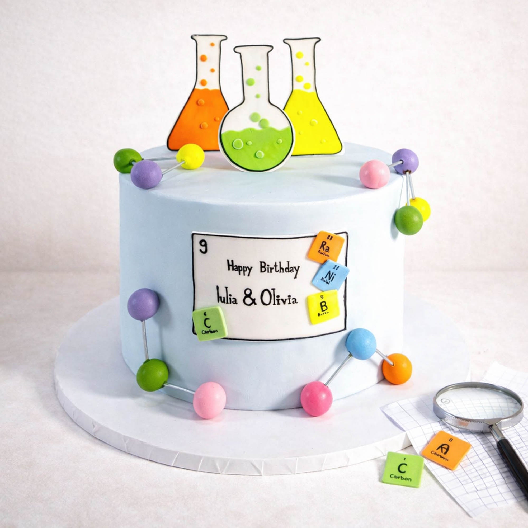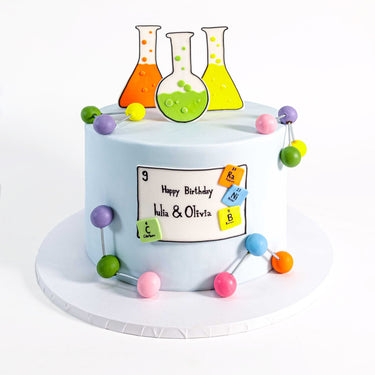 A 'Free From' version of our Science Cake - a brilliant creation for all science enthusiasts! Crafted with alternating layers of soft, sponge and smooth, velvety buttercream, each bite is a delight. The cake is expertly covered in fondant and adorned with intricate science-themed decorations, all crafted from edible fondant. Whether it’s for a budding scientist or a science-themed celebration, this cake brings both taste and imagination to the table!