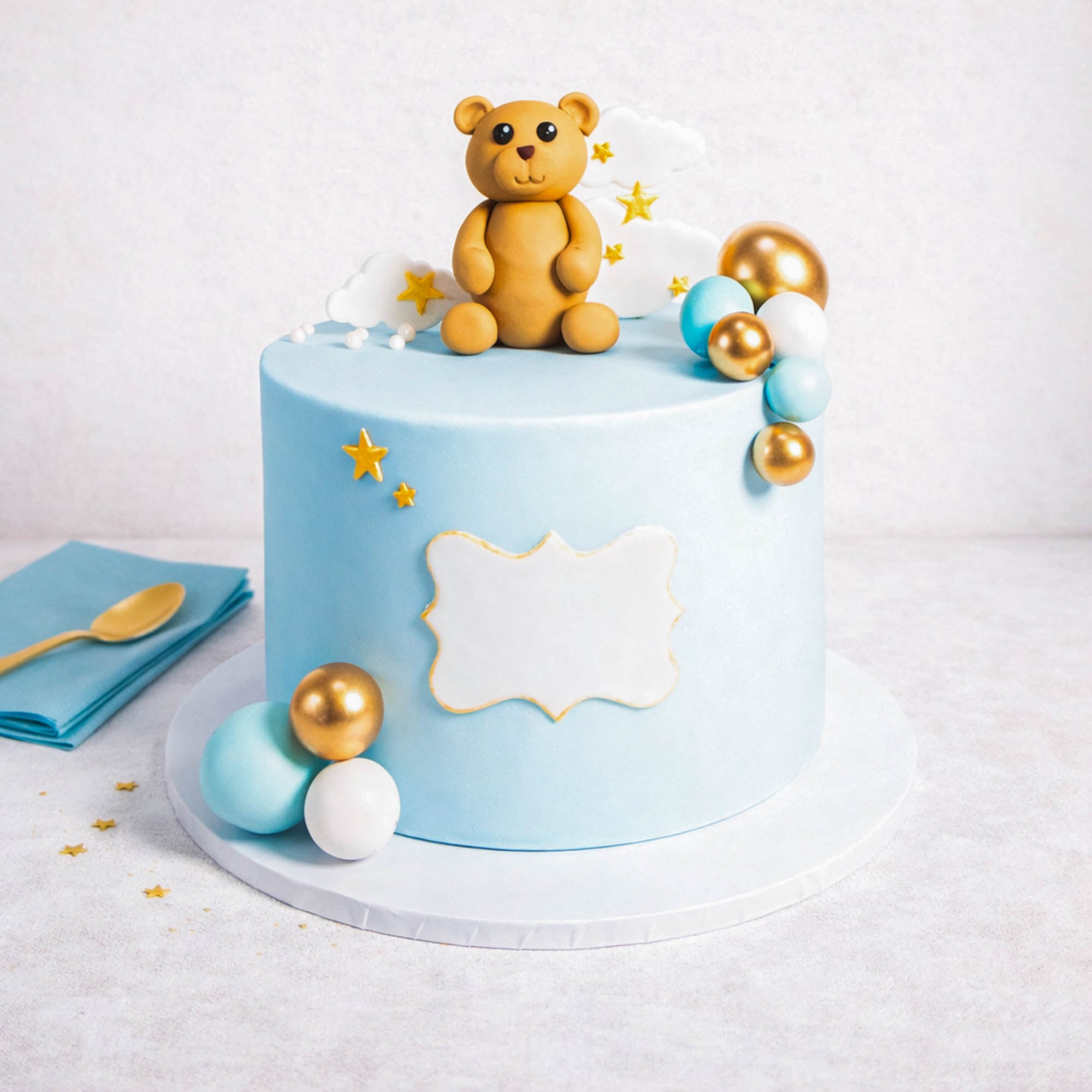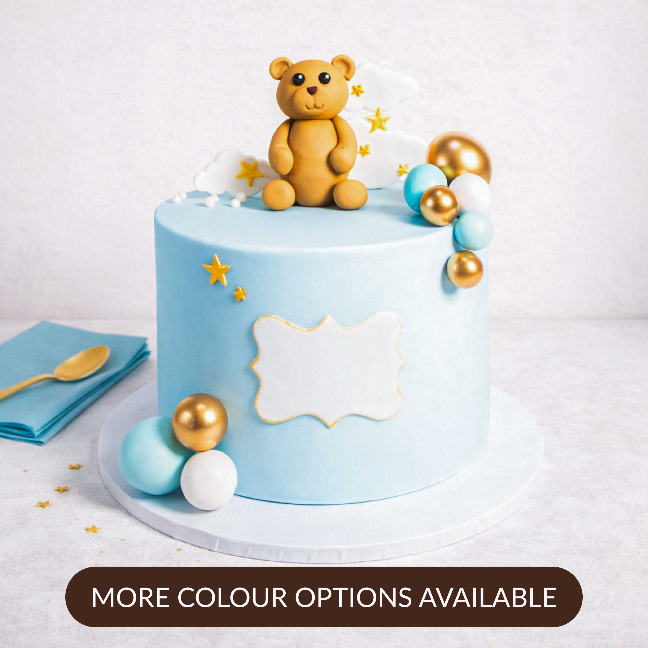 Discover our 'Free From' Teddy Bear Cake, expertly crafted with layers of airy sponge and velvety buttercream. Enveloped in smooth fondant, this charming cake is adorned with a hand-crafted teddy bear and mini balloons, adding a playful elegance. Ideal for any special occasion, it can be personalised by selecting your preferred colour scheme from the swatches. Please note, fondant decorations may include wire supports and are not edible. Delivery available in London, Sussex, and Surrey.