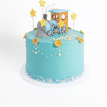 Perfect for a kids birthday, made with alternating layers of light, fluffy sponge, and silky vanilla buttercream. Decorated with sugar 'buttons', buttercream piping, and a handmade sugar train.