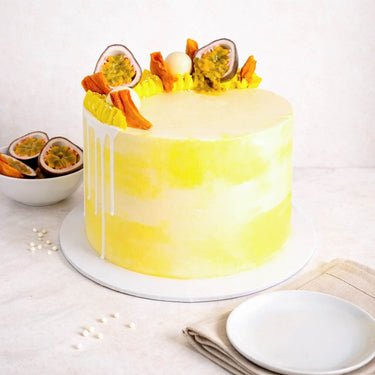 Experience the refined balance of flavours in our ‘Free From’ White Chocolate Passionfruit Cake, thoughtfully designed to be gluten friendly. This exquisite cake presents alternating layers of moist vanilla sponge, enriched with a smooth white chocolate passionfruit buttercream, and enhanced by a bright mango and passionfruit coulis. The cake is elegantly finished with a rich chocolate drip, fresh passionfruit, dried mango pieces, white chocolate truffles, and delicately piped buttercream. Crafted using premium Belgian white chocolate, it delivers a sophisticated taste.