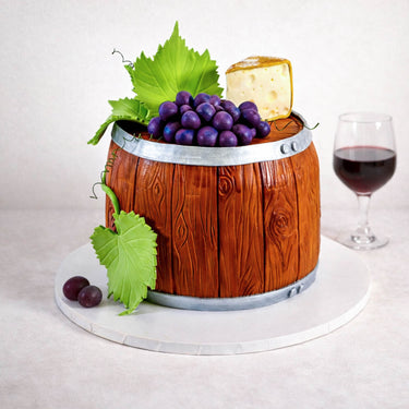 A 'Free From' version of our Wine Barrel Cake, perfect treat for wine lovers! Designed to resemble a rustic wine barrel, this cake is covered in smooth fondant and decorated with handcrafted fondant grapes, vine leaves, and even a little block of cheese for a playful touch. Inside, you’ll find alternating layers of light, fluffy sponge and silky buttercream, with a variety of delicious flavours to choose from. No matter which flavour you pick, the cake will maintain its stunning wine-themed design, making it an impressive centrepiece for any celebration.