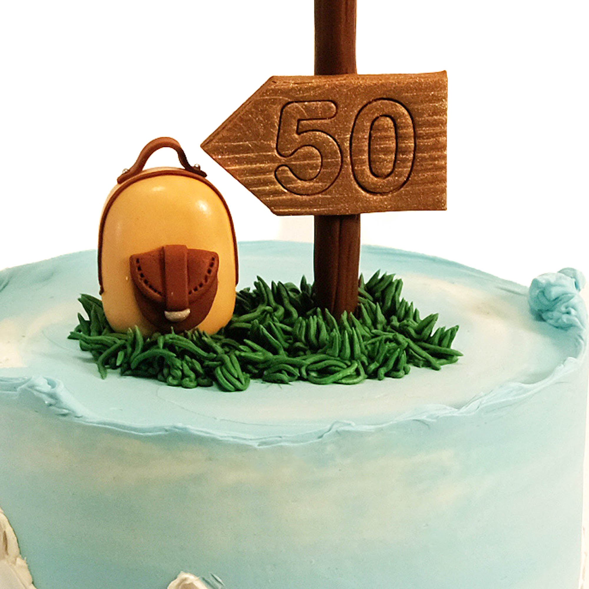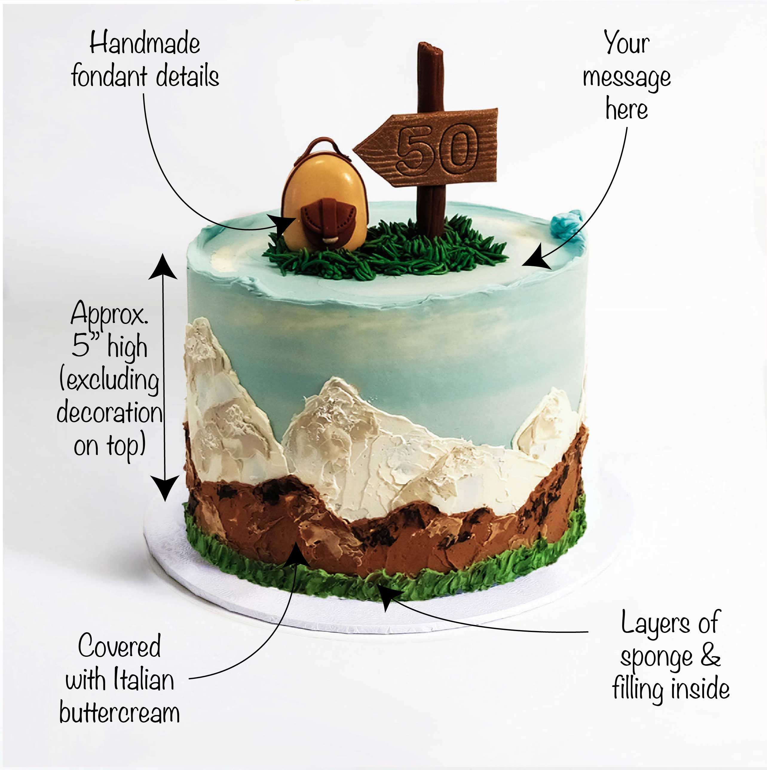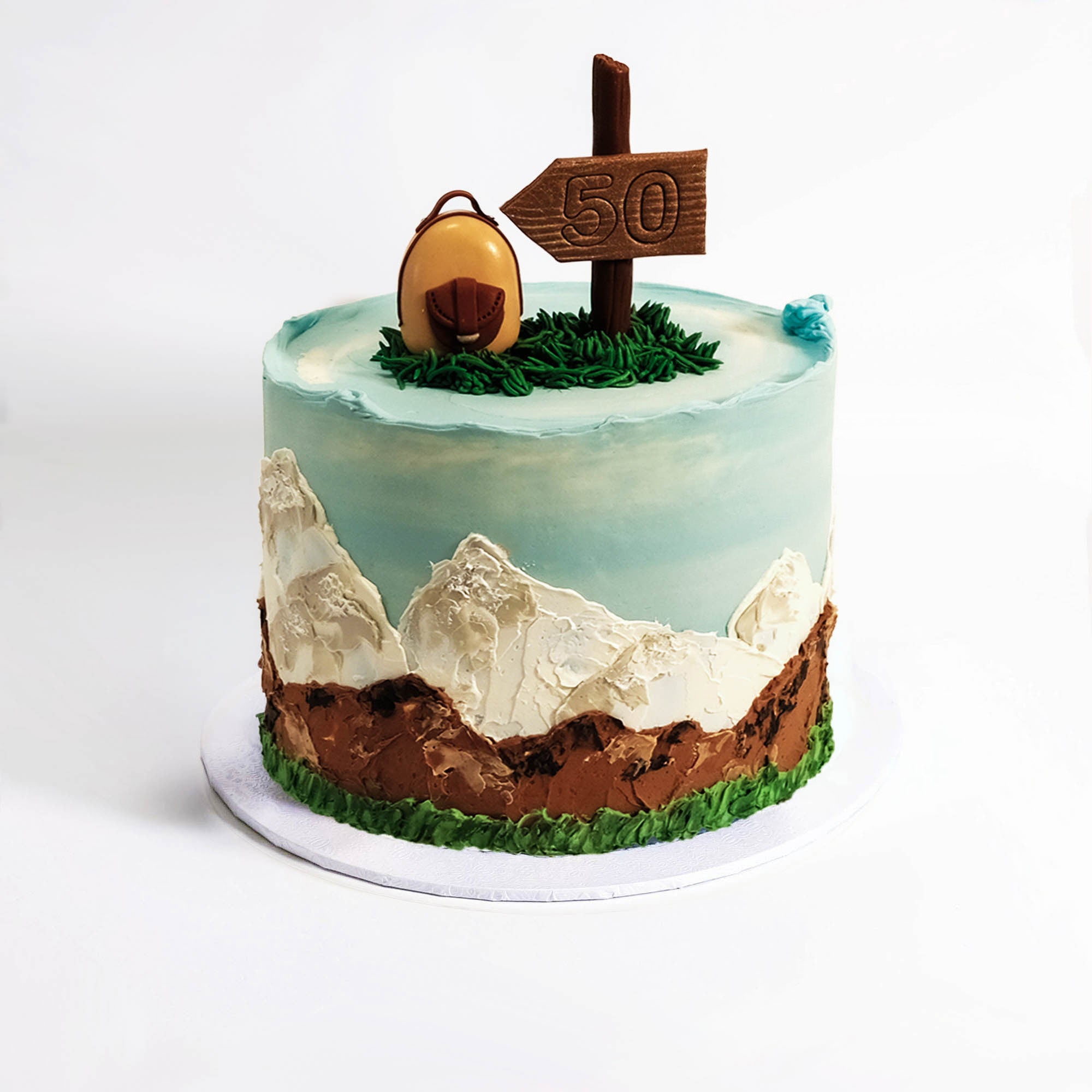 Our Hiking Cake, hand painted with buttercream to create a mountain effect on the sides, topped off with buttercream grass, a fondant backpack and little wooden sign. With alternating layers of light fluffy sponge and silky buttercream, lots of flavours to choose from, the cake will look the same no matter which one you go for.