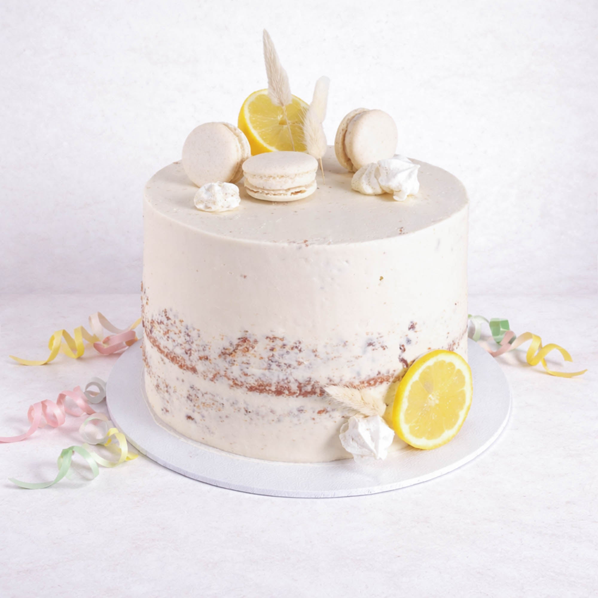 Our Classic ‘Semi Naked’ Lemon Drizzle Cake, made with alternating layers of light, fluffy lemon sponge, lemon curd and lemon buttercream. Decorated with meringues, fresh lemons and macaroons. Made with free range organic eggs.