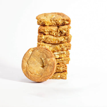 Our Lemon and White Chocolate Cookies, soft and chewy vanilla cookies stuffed with zesty lemon curd Belgian chocolate chips. Made with the highest quality ingredients to provide a rich and mouthwatering flavour with every bite. Enjoy the convenience of having these freshly baked cookies delivered straight to your door! Made with free-range organic eggs and Belgian chocolate.