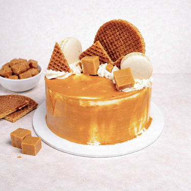 A mini version of our indulgent Salted Caramel Cake, made with alternating layers of light, fluffy sponge, caramel layer and silky caramel buttercream. Topped off with fudge pieces, macaroons and stroopwafles. Made with free-range organic eggs.